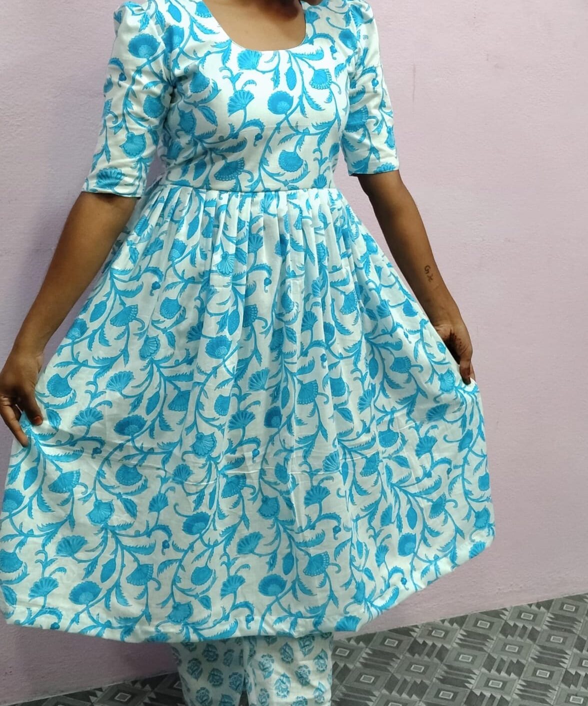 Stay stylish and comfortable with this beautiful aqua floral printed fit & flare kurti paired with matching pants. Perfect for casual wear, office, outings and festive moments.